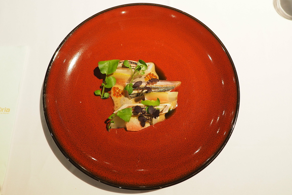 非常特別的筍片與海苔片合併製成的小品,底下附的是荷蘭醬,從沒想過的搭配吃起來令人相當驚艷!