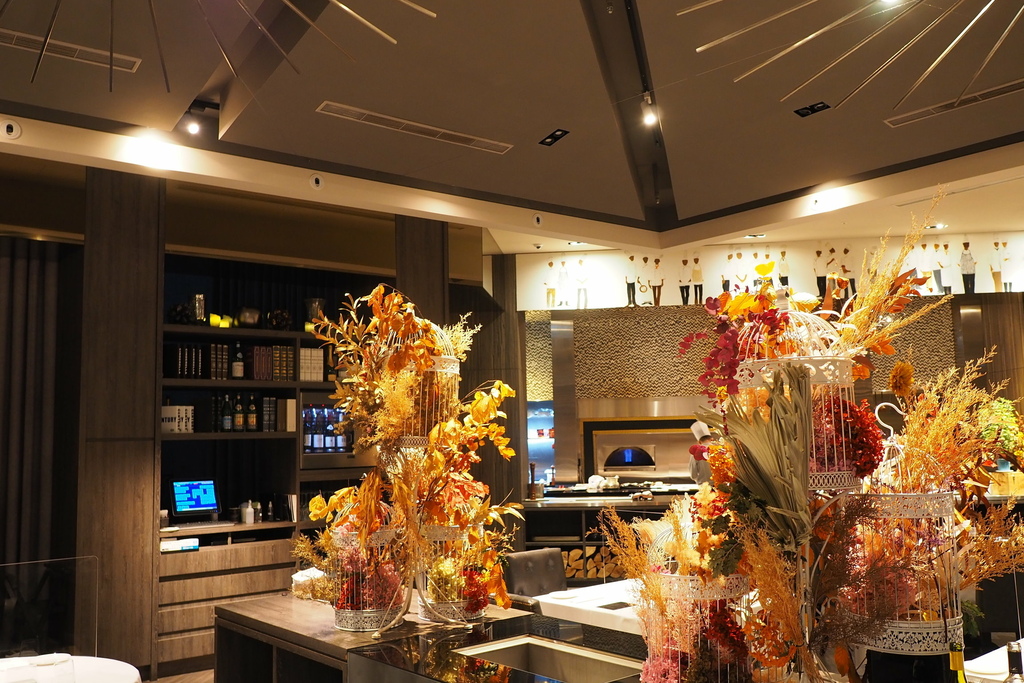 今年九月迎來的秋季妝點,是由恆溫花藝所 (Vacuum florist)打造的,以偏向金黃的大地色為主,加上餐廳一些金屬裝飾,非常美麗