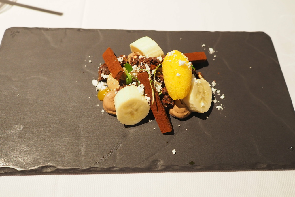 甜點除了主廚甜點以外剩黑巧克力可以選,配上香蕉和百香果雪酪,整體擺盤呈現與份量都超乎我預期![]()
